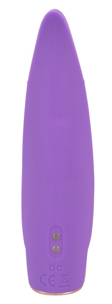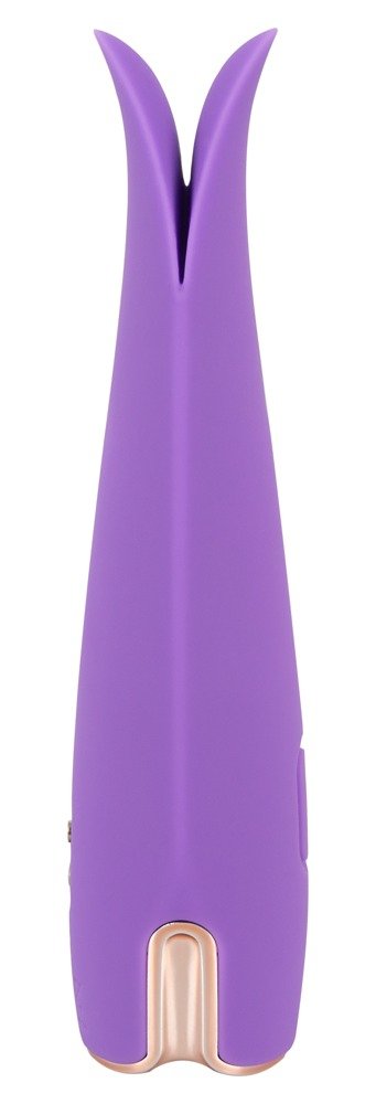 Mini vibrador con doble lengüeta flexible, 10 modos de vibración y textura sedosa, perfecto para una estimulación precisa y placentera.