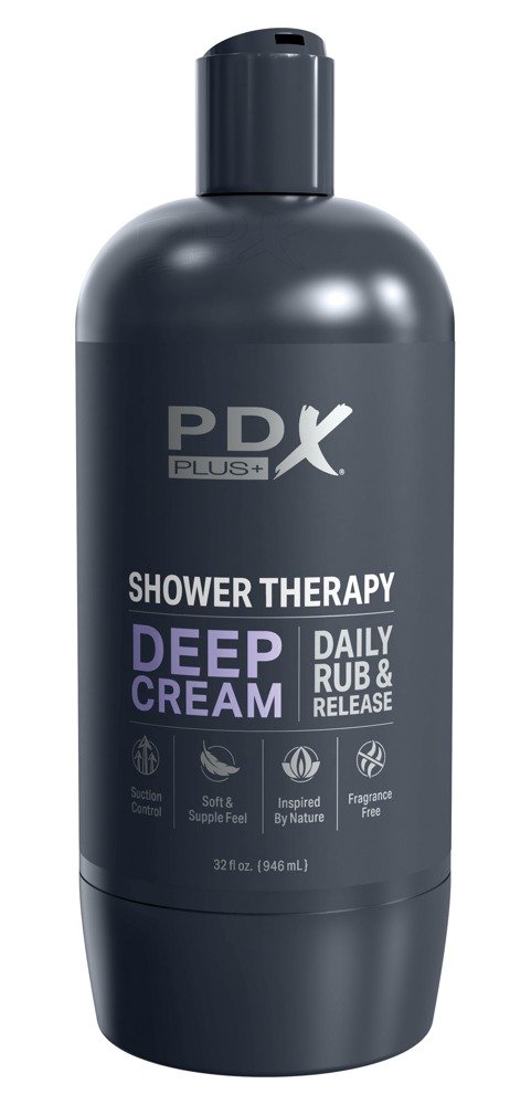 El Shower Therapy Deep Cream de PDX Plus es un masturbador ingeniosamente disfrazado como un bote de champú, ideal para disfrutar del placer más íntimo con total discreción. Su funda interior de material Fanta Flesh, suave y elástico, ofrece una textura realista que se calienta rápidamente con la temperatura corporal. En su interior, una estructura con estrías y relieves estimula intensamente el pene, mientras que el tapón abatible permite regular el efecto de succión para un control total de la sensación. Además, incluye una base de succión que se enrosca para usarlo sin manos sobre cualquier superficie lisa.