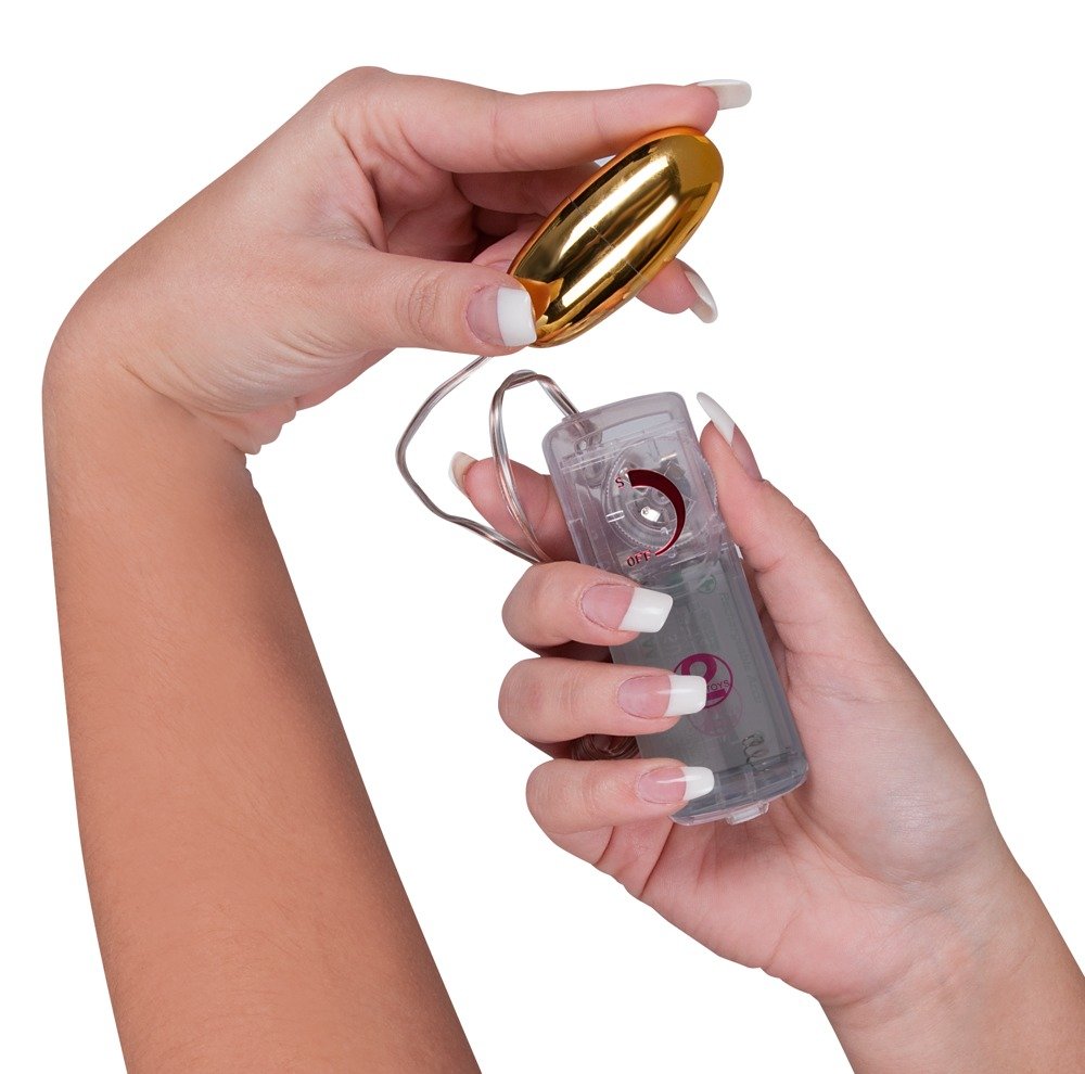 Huevos vibradores dorados con control de intensidad y acabado brillante para una estimulación elegante y versátil.
