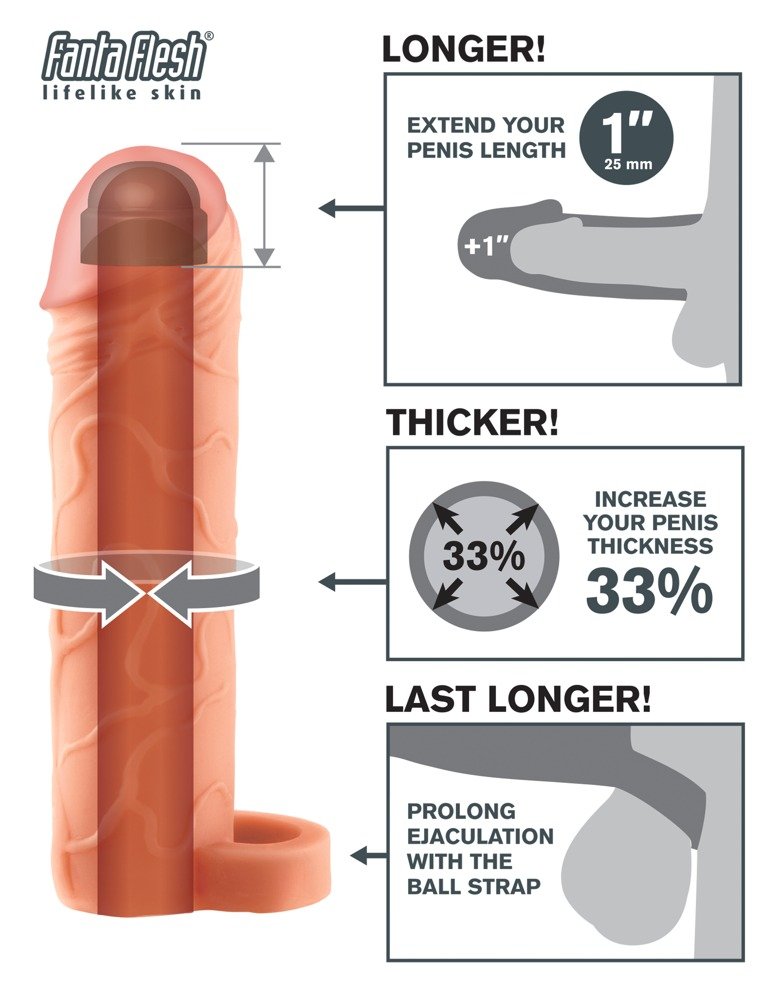 Aumenta el tamaño y la firmeza con una funda realista que añade 2,5 cm y ofrece un ajuste seguro con anillo testicular.