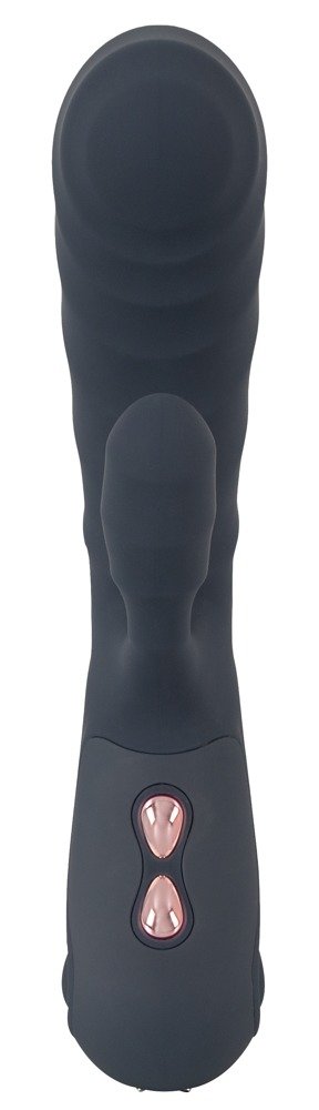 Vibrador tipo conejo con doble motor y textura estriada para una estimulación interna y externa simultánea.