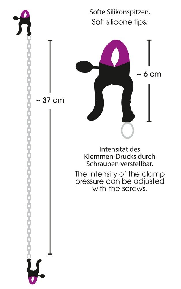 Este sofisticado collar combina diseño y erotismo en una sola pieza. Su cadena metálica de acabado plateado sostiene dos pinzas ajustables para pezones, decoradas con detalles en negro y púrpura que aportan un toque elegante y seductor. Fabricado con materiales resistentes y agradables al tacto, permite ajustar la presión de manera precisa para disfrutar de una estimulación personalizada, combinando estética, control y placer en cada momento.