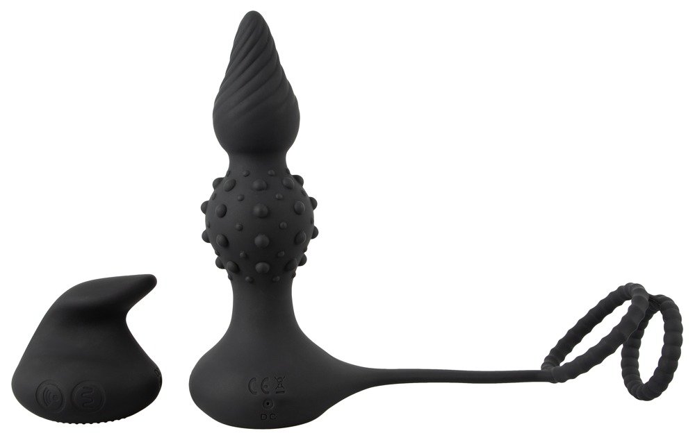Anillo doble con plug anal vibrador y control remoto, diseñado para estimulación simultánea del pene, testículos y perineo.